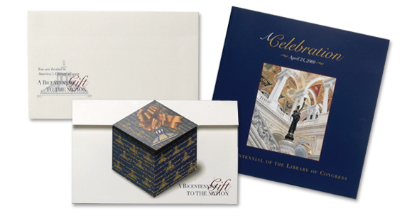 The Bicentennial was a momentous event for the Library, and we produced elegant commemorative invitations and programs for the VIP guests. Drawing from the theme “A Bicentennial Gift to the Nation,” the invitation resembled a gift package that opened to reveal striking images and translucent invitation inserts for the various events. The commemorative program employed decorative sheer end pages and spot varnishes to further enhance its visual impact.
